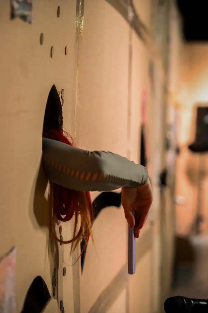 Descartes-Borderline is a performance that takes place in a space where the walls have been duplicated by a cardboard wall that runs through the entire space. On this second wall there are a series of holes from where things and body parts come out at different moments of the performance. Other holes spit objects of mass consumption such as a cell phone, cleaning supplies, soap, chewing gum, slime, smoke, trumpets, expired pills and coins. Between the first wall and the second wall the performer will move around telling a monologue about a log- ical event that happened to her after a free diagnosis she received in the street where a group of men instead of calling her “crazy” calls her “Borderline”.