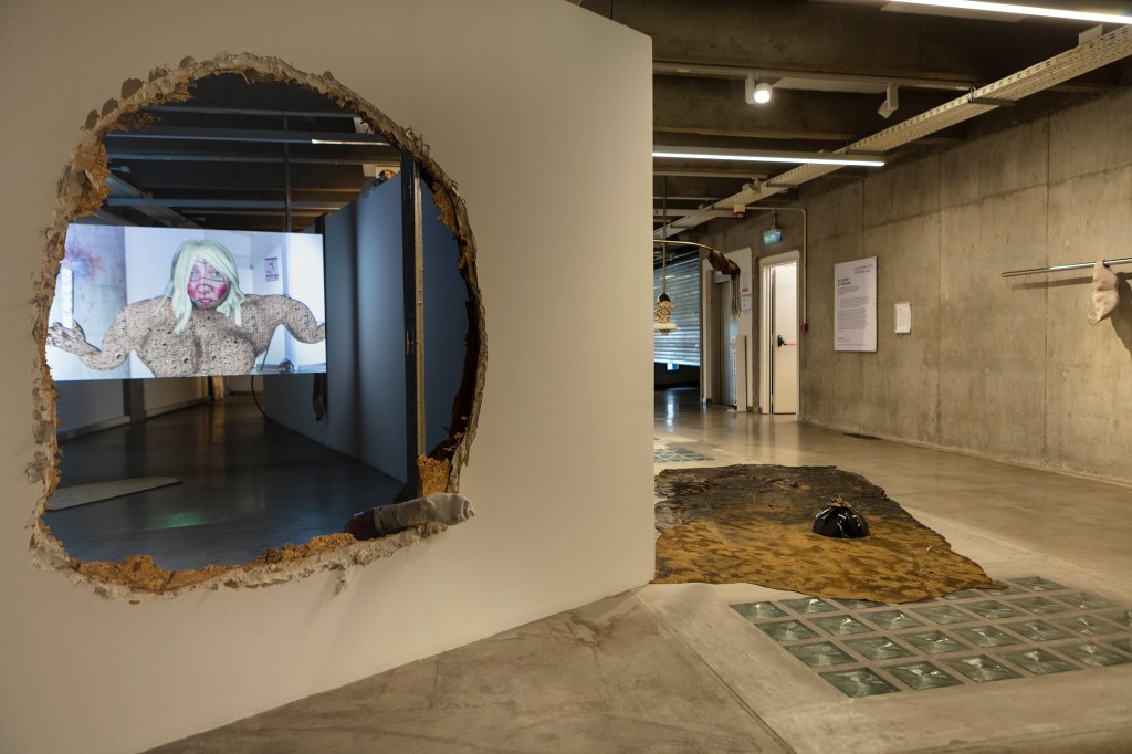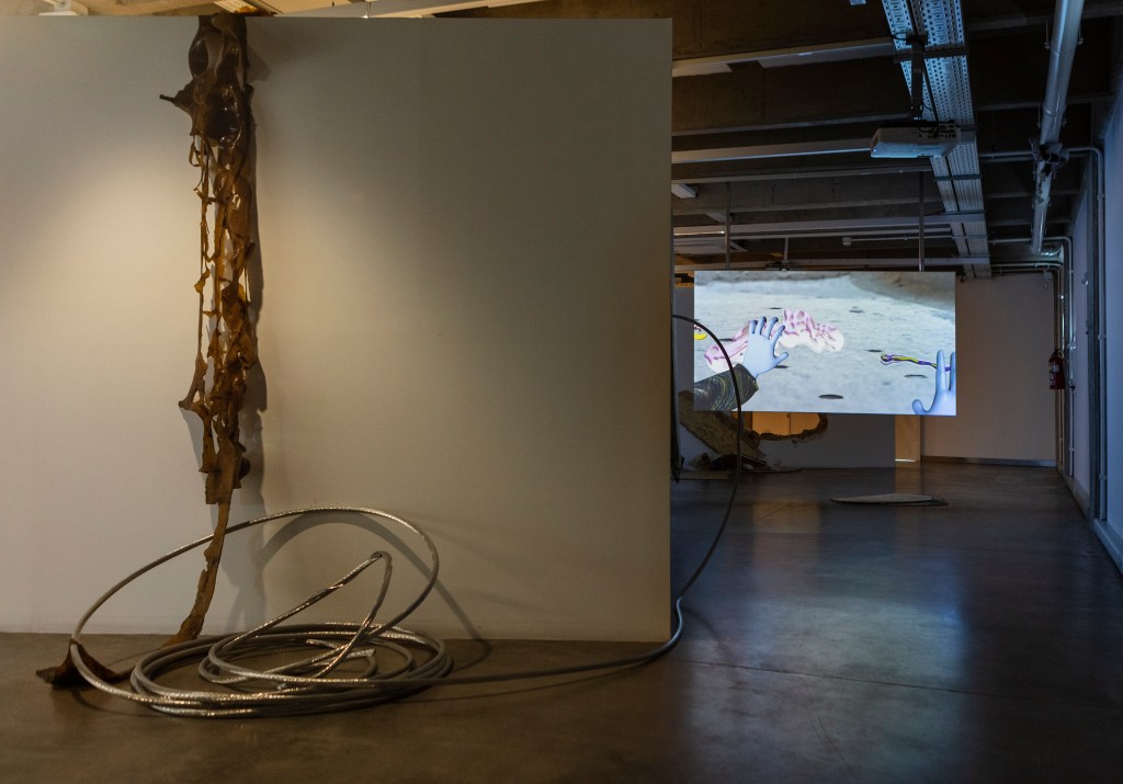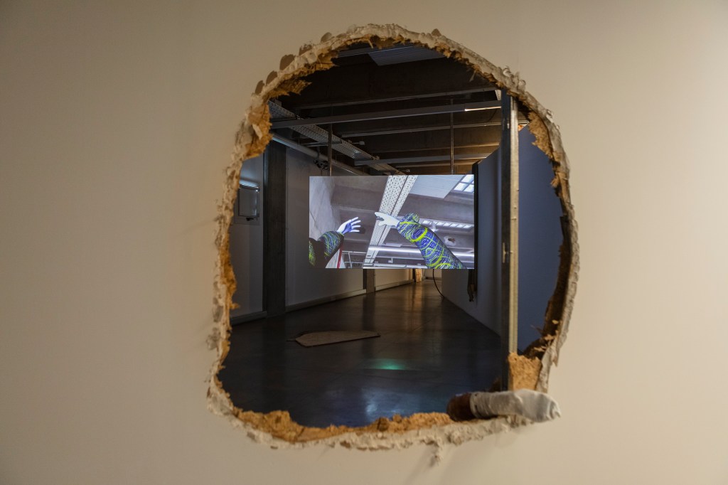 Liv Schulman, for her part, presents Persona, an audiovisual work starring the artist herself, which narrates a fiction set in the same space where the exhibition takes place. In her efforts to film a movie about the appearance of a giant and sensual leech in a community, the character wanders around the room, which is transformed as the story unfolds. Meanwhile, she loses the limits of her body. Grounded in an insane use of language that stresses fiction with absurd humor, the video investigates the erasure of identities as well as desires and anxieties of contemporary society.