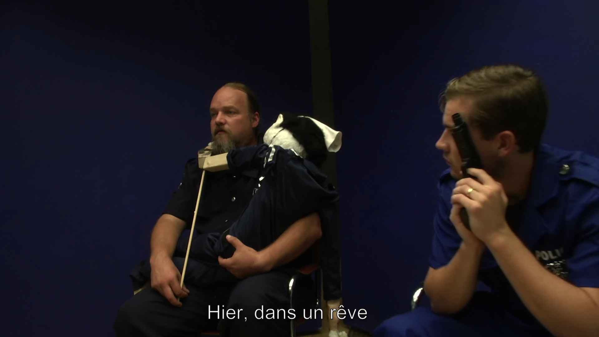 At a very staged police station a group of real policeman interrogate their relation to uniforms, sexuality, religion and work. This film was commissioned and showed at the Växjö Konsthall in Sweden at the show Det fatala momentet in September 2018.